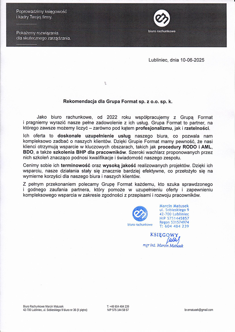 - Spokój i pewność, że Twoje biuro działa zgodnie z przepisami