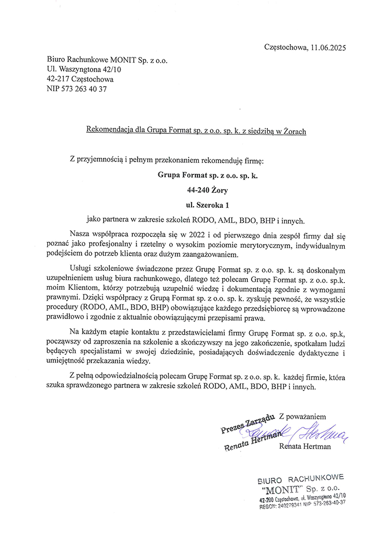 - Bezpieczną dokumentację gotową na ewentualne kontrole GIIF oraz innych podmiotów uprawnionych do kontroli